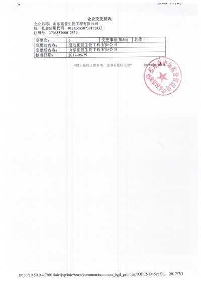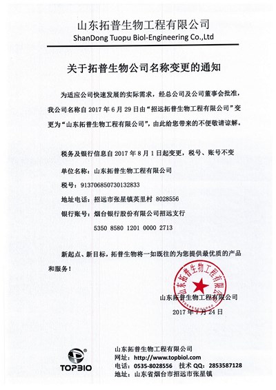 为适应公司快速发展的实际需求,经总公司及公司董事会批准,我公司名称自2017年6月29日由“招远拓普生物工程有限公司”变更为“山东拓普生物工程有限公司”,由此给您带来的不便敬请谅解。